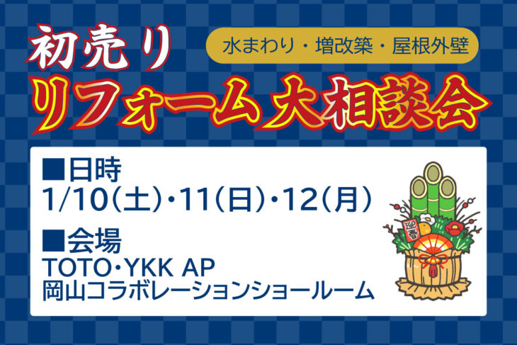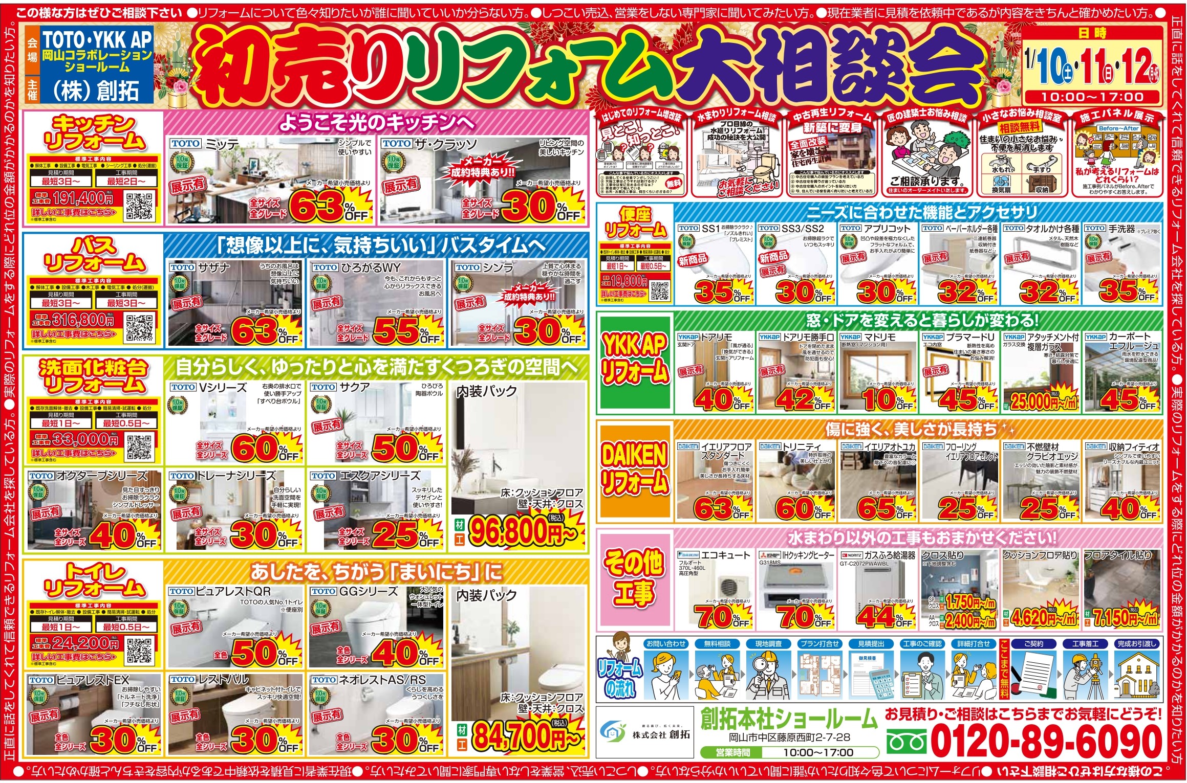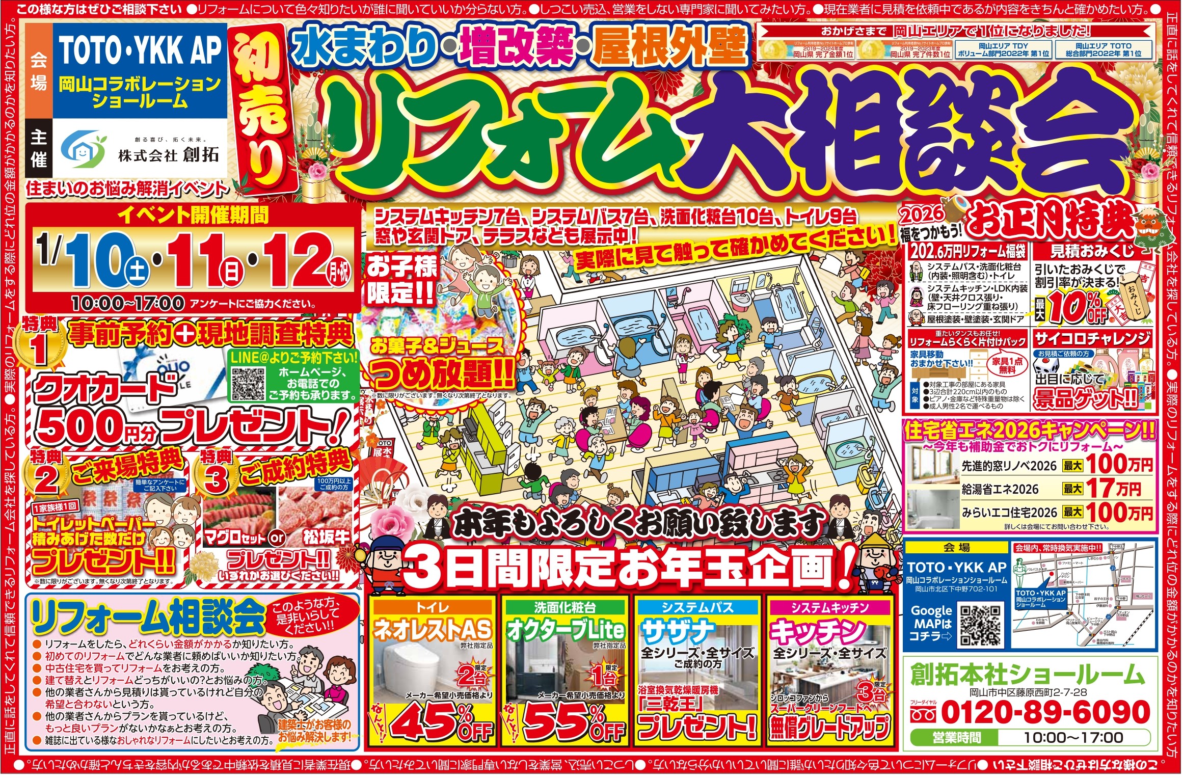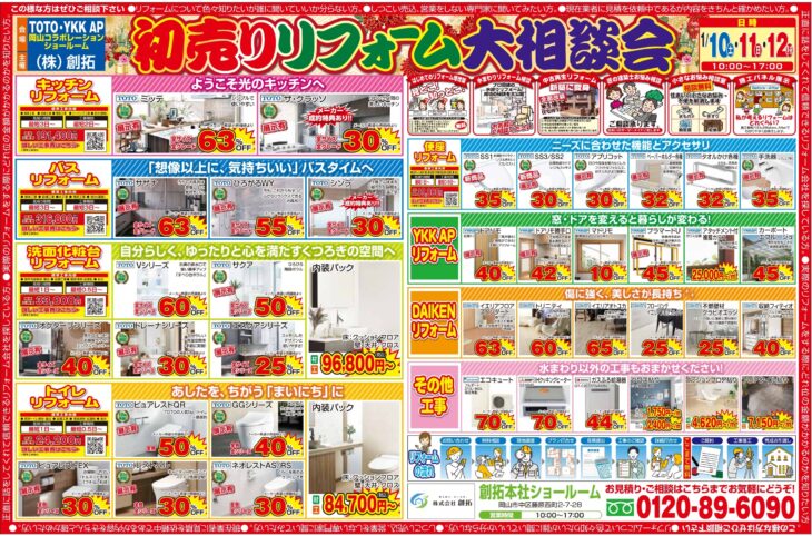本日1月10日からの三連休、『リフォーム大相談会』と題しまして「TOTO、YKK AP岡山コラボレーションショールーム」にて創拓本店スタッフで住まいのご相談をお受けしております!