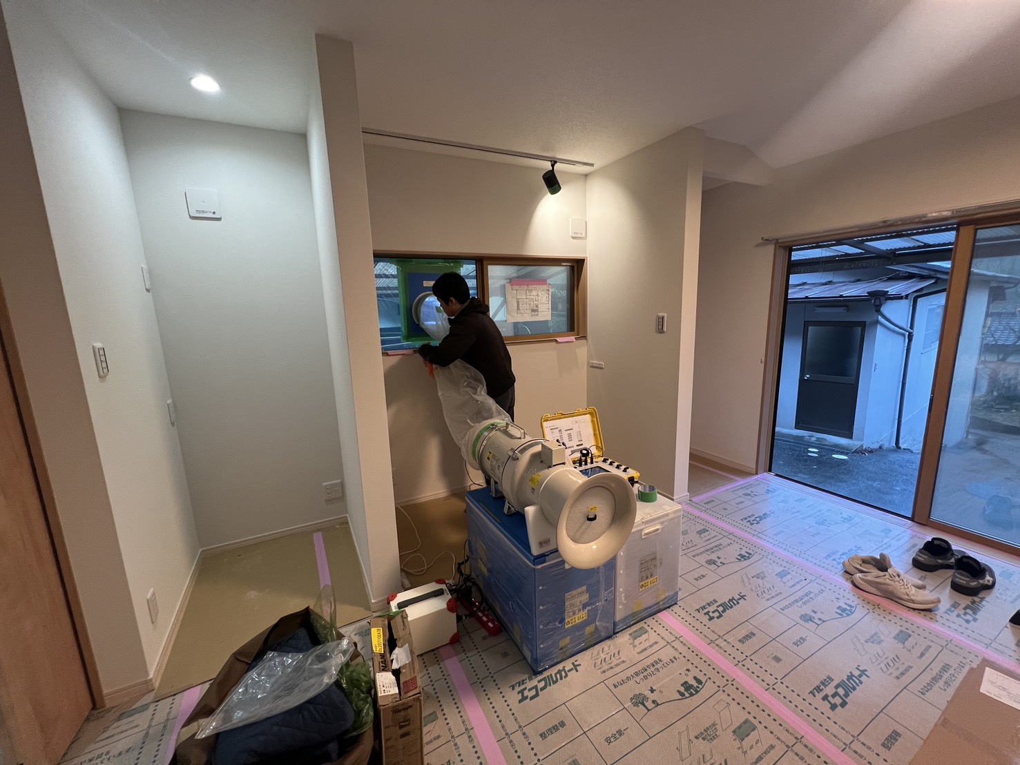 今回のリフォーム工事では、工事の途中段階で「気密試験」を行いました。