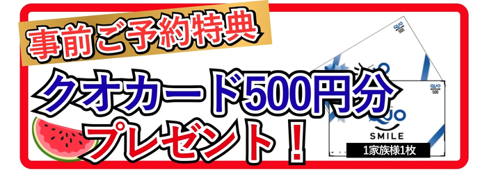 事前にホームページまたはお電話からご予約いただいた方には、クオカード 500円分 をプレゼントいたします(1家族1枚まで)。