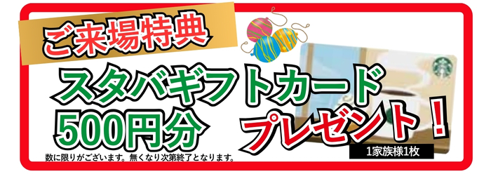 会場でアンケートにご回答いただいた方に、スターバックスギフトカード 500円分 をプレゼント。ご家族で1枚までの進呈となります。
