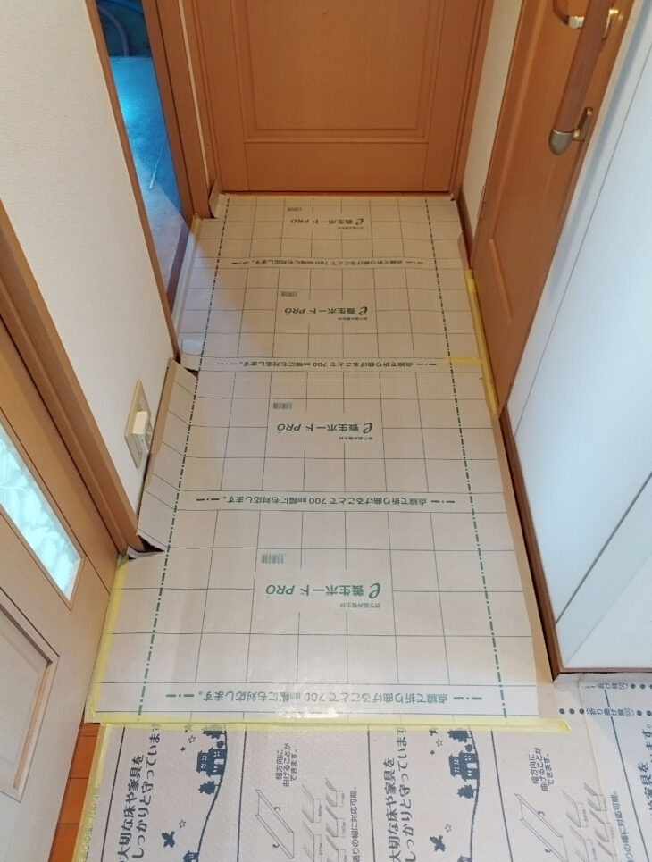 マンションはお施主様のお宅(専有部)に加え、他のご入居者様と共有しているエレベーター内や通路等も工事中使用させていただくようになります。専有部・共用部共、養生を敷設するところから工事スタートです。(敷設範囲はマンション毎にかわります。管理人様としっかり打合せをしながら養生を施していきます。)